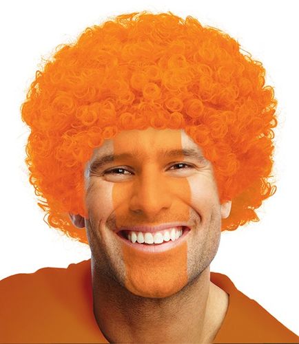 Peruka w stylu afro, kręcone włosy. Kolor pomarańczowy. Peruka ma wszytą gumkę, dzięki czemu świetnie trzyma się na głowie.