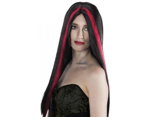 Peruka Aurora czarno-czerwona. Czarne długie włosy z czerwonymi pasemkami. Stwórz kobiecą kreację na Halloween lub bal karnawałowy z jednym z eleganckich kostiumów.