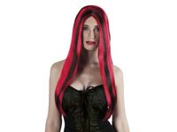 Peruka Aurora czerwono-czarna. Czerwone długie włosy z czarnymi pasemkami. Stwórz seksowną kreację na Halloween lub bal karnawałowy z jednym z kobiecych kostiumów.