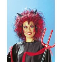 Peruka z rogami w kolorze czerwono-czarnym z kręconymi sztucznymi włosami. Włosy są doczepione do specjalnej siateczki. Długość rogów - ok. 16 cm. Długość włosów do ramion. Rozmiar uniwersalny dla osoby dorosłej.