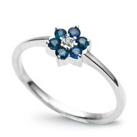 Staviori Pierścionek. 1 Diament, szlif brylantowy, masa 0,005 ct., barwa H, czystość I1. 6 Szafirów, masa 0,20 ct.. Białe Złoto 0,585. Średnica korony ok. 7 mm. Wysokość 3,1 mm. Szerokość obrączki ok. 1,65 mm.
