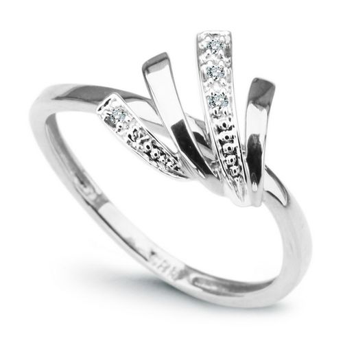 Staviori Pierścionek. 5 Diamentów, szlif achtkant, masa 0,03 ct., barwa H, czystość I1. Białe Złoto 0,585. Średnica korony ok. 10 mm. Szerokość obrączki ok. 1,5 mm.