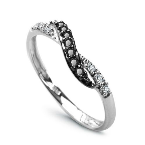 Staviori Pierścionek. 6 Diamentów, szlif brylantowy, masa 0,03 ct., barwa H, czystość I1. 7 Diamentów, kolor czarny, szlif brylantowy, masa 0,07 ct.. Białe Złoto 0,585. Szerokość 2-4 mm.