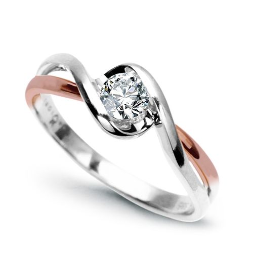 Staviori Pierścionek. 1 Diament, szlif brylantowy, masa 0,25 ct., barwa G, czystość SI1. Białe, Różowe Złoto 0,585. Średnica korony ok. 6 mm. Wysokość 3,2 mm. Szerokość obrączki ok. 2 mm. Dostępny z dowolnym innym Brylantem na indywidualne zamówienie. --------------------- Niezwykle piękny i popularny wzór z dwóch kolorów 14-karatowego złota: różowego oraz białego. Pośród nich, cudowny brylant oprawiony tak, aby nie wystawać nic ponad taflę pierścionka i tym samym bezproblemowy w codziennym użytkowaniu. Elegancki wzór ze sporym kamieniem nadaje się zarówno na pierścionek zaręczynowy, jak i na prezent z innej okazji.