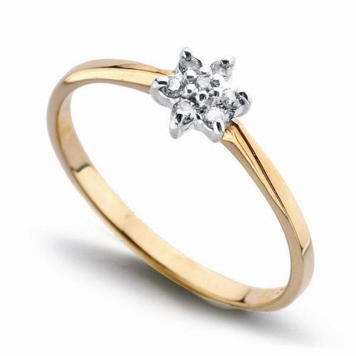 Staviori Pierścionek. 7 Diamentów, szlif brylantowy, masa 0,08 ct., barwa I-N, czystość SI2-I1. Żółte, Białe Złoto 0,585. Średnica korony ok. 6 mm. Wysokość 3,8 mm. Szerokość obrączki ok. 1,3 mm.