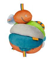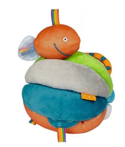 Miękka kolorowa piłeczka edukacyjna. Wykonana z miłych w dotyku materiałów o różnych fakturach. Piłeczka pozwoli dziecku na nowe ciekawe dla niego doznania dotykowe i słuchowe . W piłeczce ukryły się zwierzątka: szeleszczący miś i pingwin, piszcząca rybka oraz silikonowy gryzak. Zwierzątka można wyjmować i wkładać do piłeczki, dzięki temu dziecko ćwiczy motorykę małą.