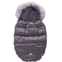 Elegancki, błyszczący śpiworek niemowlęcy w kolorze szarym, wykończony szarym, odpinanym futerkiem. Z przodu znajduje się ozdobna naszywka ze śnieżynką.