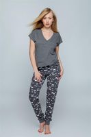 Nowość! Dwuczęściowa piżama od Sensis tym razem w szarym kolorze, z długimi, wzorzystymi spodniami i gładką bluzką. Bluzka z krótkim rękawem, z dekoltem w szpic, bardzo fajnie leży na sylwetce. Spodnie na gumce, ze ściągaczami w dolnej części. Skład: 92% bawełna, 8% elastan.