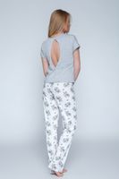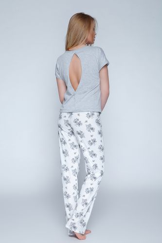 Wyjątkowa piżama damska z efektowną, gładką bluzeczką z pęknięciem na plecach. Stwórz zmysłowy dekolt w tym miejscu! Jej szary kolor idealnie współgra z delikatnym, jasnym kremem spodni, które dodatkowo zadrukowano pięknymi, kwitnącymi, szarymi różami. Jedna z najlepszych piżam sezonu i to oczywiście w przyjemnej dla ciała bawełnie. Skład: 92% bawełna, 8% elastan.