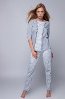 Efektowna, dwuczęściowa piżama damska z nowej kolekcji marki Sensis, zdobiona pięknym, kwiecistym wzorem, który imituje koronkę. Romantyczna i bardzo kobieca, a do tego mega wygodna. Bluzka wyróżnia się atrakycjnym dekoltem w formie migdału oraz modnymi rękawkami o długości 3/4. Przód z dekorem i ozdoboną falbanką. Spodnie zapewnią Ci najwyższą wygodę - zgrabne, proste nogawki, gumka w pasie, delikatna tkanina. Skład: 92% bawełna, 8% poliester.