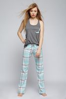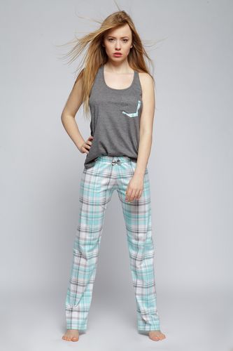Szukasz czegoś interesującego? Oto dwuczęściowa piżamka ze spodniami w miętową kratę. Góra w formie bluzeczki - bokserki, z kieszonką, seksownie układa się na sylwetce. Spodnie o prostych nogawkach, na gumce, bardzo wygodne. Cienka bawełna będzie idealna również na wiosenno-letni sezon. Polski producent. Skład: 92% bawełna, 8% elastan.