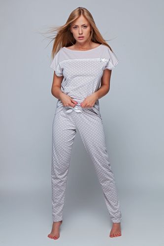 Śliczna, kobieca piżamka w kropeczki, z najnowszej kolekcji marki Sensis. W kawowym kolorze. Bluzka lekko oversizowa, zdobiona lamówką z koronki, którą wieńczy mała, słodka kokardka. Góra gładka, z migdałowym dekoltem, który subtelnie podkreśla ramiona. Spodnie o wygodnych, długich nogawkach, z kokardką w pasie. Skład: 100% bawełna.