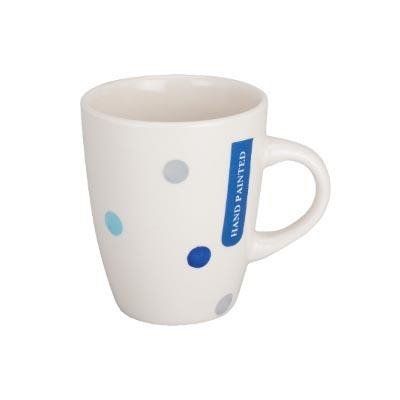 Wykonany z ceramiki i ozdobiony groszkami w kolorach niebieskim oraz szarym – ręcznie malowane