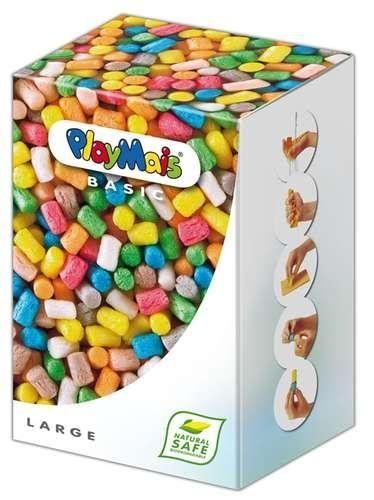 PlayMais Duży - skład zestawu: ponad 700 PlayMais, gąbeczka, biodegradowalny nożyk, instrukcja. Koniec z brudnymi dywanami i stołami! Wyprodukowany w Niemczech ze skrobi kukurydzianej i barwników spożywczych, PlayMais jest ekologicznym materiałem kreatywnym, który gwarantuje świetną i przede wszystkim bezpieczną zabawę. Nie zawiera żadnych substancji szkodliwych dla zdrowia. Nie istnieje też ryzyko zadławienia w wypadku przypadkowego połknięcia przez dziecko. PlayMais po prostu rozpuści się. Wystarczy jedynie wilgotna ściereczka aby go ze sobą łączyć. Można go dowolnie kształtować dłońmi, ciąć nożykiem plastikowym (w innych zestawach jest zawarty biodegradowalny nożyk z kukurydzy), czy nożyczkami dla uzyskania bardziej szczegółowych detali. Co charakteryzuje PlayMais: jest plastyczny jak plastelina, kolorowy jak tęcza, bezpieczny i lekki jak chrupek, można po nim pisać jak po papierze. Może służyć do: budowania dużych budowli (doskonała nośność), do dekorowania doniczek, obiektów zarówno plastikowych jak i szklanych, stworzenia płaskiej "kartki", aby z niej wyciąć dowolny motyw, uzyskania efektów które nie są dostępne dla innym mas plastycznych np. efekt "pierza". Produkt zdobył wiele nagród i wyróżnień, m. in. elitarną nagrodę Spiel gut i ToyTalk. PlayMais stymuluje wszechstronny rozwój dziecka m. in.: rozwój kreatywności i rozpoznawania kolorów, odkrywanie kształtów i form, rozwój zmysłu dotyku i prawidłowych umiejętności motorycznych, rozwój osobowości, rozwój umiejętności interpersonalnych w grupach, rozwój wyobraźni przestrzennej i zdolności myślenia bez ram czasowych, świetne rezultaty podczas zajęć terapeutycznych oraz wspaniała integracja całej rodziny poprzez zabawę.