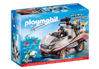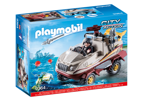 Playmobil - Amfibia. Zestaw ten z pewnością przypadnie do gustu każdemu małemu chłopcu zafascynowanemu policją i innymi formacjami specjalnymi. Seria Playmobil City Action przenosi dziecko do świata policji, straży pożarnej i innych instytucji pożytku publicznego. Dziecko może wziąć udział w akcjach ratunkowych nie tylko w mieście, ale i na lotnisku czy też na wodzie.
