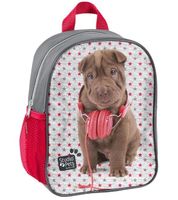 Mały plecak przedszkolny, jedna komora. Z boku plecaka znajduje się mniejsza kieszonka wykonana z siatki na butelkę, bidon lub termos. Regulowane szelki, wygodny uchwyt do przenoszenia.
