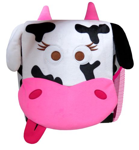 Plecak w kształcie krowy. Urzekająca oryginalnością i estetyką prezentuje się bardzo efektownie. Przód w formie klapy wykonany jest z miękkiego przyjemnego w dotyku materiału. Pod klapą ukryta jest mała kieszonka na zatrzask i pojemna komora główna zabezpieczona suwakiem błyskawicznym. Tył i przód usztywniane. Ramiona są szerokie i regulowane idealnie dopasują się do każdego, górny uchwyt pozwoli na wygodne przenoszenie plecaczka,a boczna siateczkowa kieszonk pozwoli na przenoszenie napojów.
