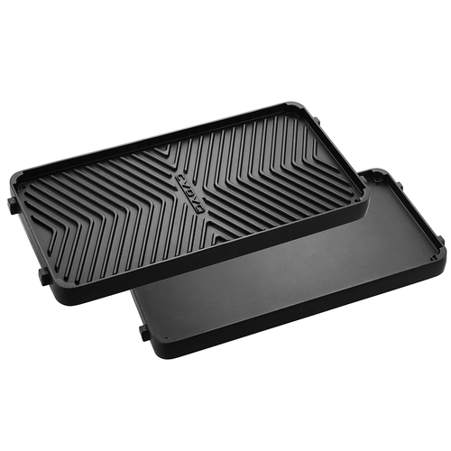 Ta obustronna, twarda pokryta teflonem płyta, z jednej strony żebrowana, z drugiej gładka jest opcjonalnym powierzchnią do gotowania do grill CADAC serii Stratos. Gładka strona idealnie spełnia rolę gładkiej patelni do smażenia ryb, omletów czy naleśników, a strona żebrowana może służyć do grillowania mięsa, kurczaków czy warzyw.