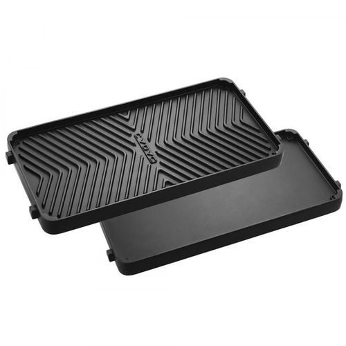 Ta obustronna, twarda pokryta teflonem płyta, z jednej strony żebrowana, z drugiej gładka jest opcjonalnym powierzchnią do gotowania do grill CADAC serii Stratos. Gładka strona idealnie spełnia rolę gładkiej patelni do smażenia ryb, omletów czy naleśników, a strona żebrowana może służyć do grillowania mięsa, kurczaków czy warzyw.