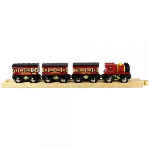 Dzieci pokochają ten bardzo szczegółowy zestaw pociągu pasażerskiego, zawierający lokomotywę, dwa tory proste oraz trzy różne wagony. Do dyspozycji mamy wagon pierwszej klasy, wagon restauracyjny oraz sypialny. Całość połączona jest za pomocą magnesów. Wysoka jakość wykonania zestawu oraz ilość kolorów czyni go wspaniałym prezentem dla każdego młodego fana kolejek drewnianych .