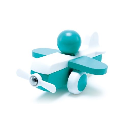Drewniany samolot na kołach. Zaokrąglone kształty dopasowane do małych rączek dziecka a wykończenie w pełni bezpieczne i nietoksyczne. Na górze samolotu znajduje się kula stanowiąca wygodny sposób na sterowanie. Wykonany z drewna pokrytego bezpieczną farbą wodną. Posiada elementy z tworzywa. Skrzydła zamontowane na elastycznych gumkach dzięki czemu odginają się amortyzując ewentualne uderzenia. Uniwersalna, ponadczasowa zabawka dla każdego malucha. Pomaga w rozwijaniu elastyczności i małej motoryki.