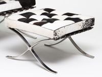 Jest to zaprojektowany w 1929 roku podnóżek, który powstał na zamówienie, i stanął w niemieckim pawilonie na wystawie w Barcelonie.,Charakterystycznie powyginana w kształt litery "X" chromowana podstawa oraz pikowana w kwadraty skóra naturalna to najbardziej charakterystyczne cechy tego podnóżka. Uzupełnieniem tego produktu jest fotel Barcelona i Barcelona stolik.,Podnóżek wykonany całkowicie ze skóry naturalnej.,