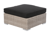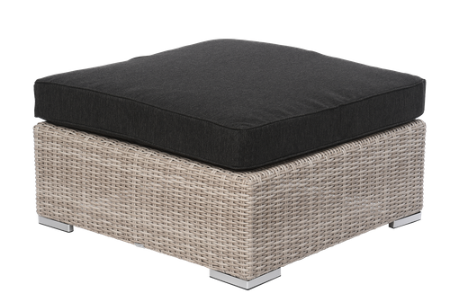 Podnóżek z poduszką West o wymiarach 87x87cm i wysokości 33cm. Podnóżek w kolorze piaskowym, wykonany ekorattanu (technorattanu) 5mm, który idealnie nadaje się do zmiennych warunków atmosferycznych oraz jest łatwy w czyszczeniu. Prosta, geometryczna forma podnóżka, wzmocniona miękką poduszką kolorze grafitowym. Wykonanie poduszki z materiału sunproof sprawia, że jest ona łatwa w utrzymaniu czystości (wystarczy przetrzeć ściereczką z mikrofibry nasączoną wodą z mydłem), a także odporna na promieniowanie UV oraz wilgoć. Podnóżek to nowoczesna propozycja do ogrodu, można łączyć z pozostałymi elementami kolekcji West.