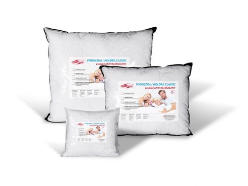Poduszka CLASSIC 50x70Poduszka CLASSIC 50x70Wyroby w poszyciu z aksamitnej tkaniny z delikatnych mikrowłókien. Tkanina ta jest gęsto tkana i kalandrowana, aby zapobiec migracji wypełnienia i uniemożliwić wnikanie zanieczyszczeń do wnętrza produktu, a jednocześnie niezwykle lekka i przewiewna. Nie zawiera sztucznych barwinków i szkodliwych substancji chemicznych, dzięki czemu jest bezpieczna nawet dla alergików. Zastosowane wypełnienie - specjalny skład mieszanki włókien HCS zapewnia niezwykłą sprężystość oraz odporność na zgniatanie. Wypełnienie jest lekkie i hypoalergiczne. Zapewnia odpowiednią cyrkulację powietrza i odprowadzanie wilgoci, a także nie traci swoich właściwości po praniu. Włóknina w kołdrach wyróżnia się specjalnym wielokierunkowym splotem włókien, co zwiększa jej trwałość. Powietrze gromadzące się w kanalikach, wewnątrz włókien, doskonale izoluje i zwiększa poczucie ciepła. Gruba i wytrzymała otoczka silikonowa każdego pojedynczego włókienka, w połączeniu z jego spiralnym kształtem skutkuje odpornością na plątanie i zbijanie się wypełnienia. Dodatkową zaletą jest łatwe pranie i suszenie w warunkach domowych. Wyroby można prać w temperaturze 60 C. Znakomicie spełniają swoją rolę w obiektach hotelowych. Wypełnienie poduszek: 100% poliester (granulat silikonowany z włókien kanalikowych HCS) Poszycie: 100% poliester (mikrofibra soft) Wykończenie: zamek błyskawiczny Opakowanie: elegancka i praktyczna walizka do przechowywania Kolorystyka zdjęć produktów może nieznacznie odbiegać od rzeczywistości