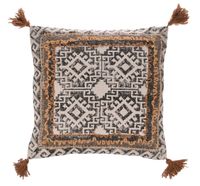 Brązowa poduszka Fiore o wymiarach 45x45cm wykonana w 100% z bawełny. Poduszka w stylu Boho z pięknym nadrukiem i czterema brązowymi frędzlami doda wnętrzu etnicznego i lekko hipisowego stylu.