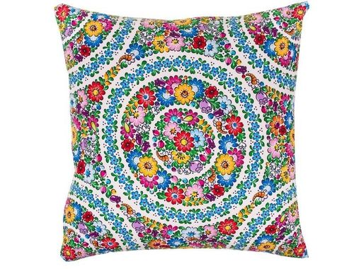 Dekoracyjna poduszka z ludowym wzorem w kwiaty z opolskich kroszonek- projekt inspirowany tradycyjnymi wzorami ludowymi z opolskich kroszonek- podobne wzory zdobią również znaną na świecie porcelanę z Opola- poszewka wykonana z delikatnej microfibry, wymienny wkład z poliestru- zapięcie na zamek błyskawiczny- folk poduszka nada wyrazu i uroku każdemu wnętrzu