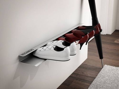 Prosta forma i funkcjonalność w użytkowaniu to cechy półki na buty Boot. Możliwość komponowania razem kilku półek a także 4 dostępne wersje kolorystyczne powodują, że półka jest nie tylko wygodna do przechowywania obuwia ale daje także możliwość ciekawego zaaranżowania przestrzeni. Wykonana została z blachy lakierowanej proszkowo o grubości 2mm. Dostępne kolory to: biel, czerń, czerwień i szary. Uwaga! Półka posiada grawerowany laserem napis (jak na drugim zdjęciu)Kolor RAL9003 - BIAŁY Wysokość: 4