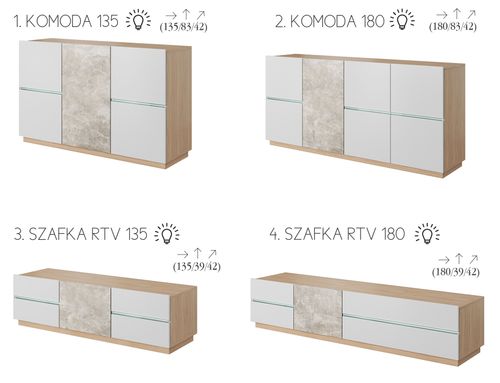 Ta kolekcja mebli jest skierowana dla miłośników ceniących minimalne formy w nowoczesnym disegnie. Zestawienie kolorów jest nietuzinkowe. Korpus w delikatnym drewnie, fronty z czystej matowej bieli i kolor który nadaje charakteru całości czyli jasny atelier, wyglądem przypomina barwy naturalnego kamienia lub betonu. Dodatkowym elementem ozdobnym jest oświetlenie LED.