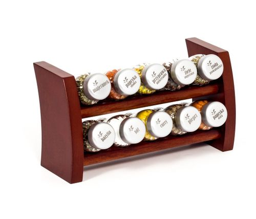 Półka z przyprawami polskiej firmy GALD wykonana z drewna bukowego trwale pokrytego potrójną warstwą lakieru ekologicznego. Pojemniki szklane z plastikowymi nakrętkami dostępne w wersji matowej lub z połyskiem.