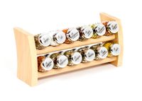 Półka z przyprawami polskiej firmy GALD wykonana z drewna bukowego trwale pokrytego potrójną warstwą lakieru ekologicznego. Pojemniki szklane z plastikowymi nakrętkami dostępne w wersji matowej lub z połyskiem.