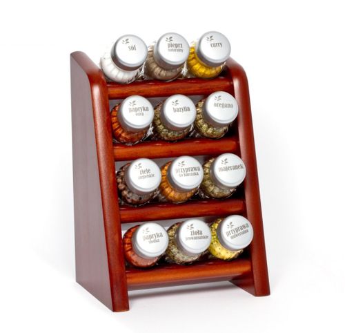 Półka z przyprawami polskiej firmy GALD wykonana z drewna bukowego trwale pokrytego potrójną warstwą lakieru ekologicznego. Pojemniki szklane z plastikowymi nakrętkami dostępne w wersji matowej lub z połyskiem.