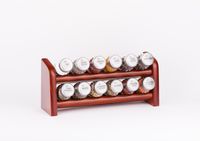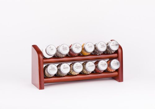 Półka z przyprawami polskiej firmy GALD wykonana z drewna bukowego trwale pokrytego potrójną warstwą lakieru ekologicznego. Pojemniki szklane z plastikowymi nakrętkami dostępne w wersji matowej lub z połyskiem.