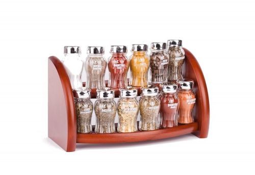 Półka z przyprawami polskiej firmy GALD wykonana z drewna bukowego trwale pokrytego potrójną warstwą lakieru ekologicznego. Pojemniki szklane z plastikowymi nakrętkami dostępne w wersji matowej lub z połyskiem.