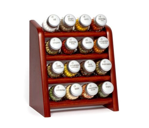 Półka z przyprawami polskiej firmy GALD wykonana z drewna bukowego trwale pokrytego potrójną warstwą lakieru ekologicznego. Pojemniki szklane z plastikowymi nakrętkami dostępne w wersji matowej lub z połyskiem.