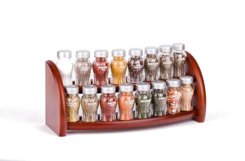 Półka z przyprawami polskiej firmy GALD wykonana z drewna bukowego trwale pokrytego potrójną warstwą lakieru ekologicznego. Pojemniki szklane z plastikowymi nakrętkami dostępne w wersji matowej lub z połyskiem.