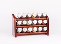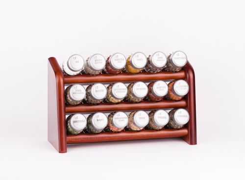 Półka z przyprawami polskiej firmy GALD wykonana z drewna bukowego trwale pokrytego potrójną warstwą lakieru ekologicznego. Pojemniki szklane z plastikowymi nakrętkami dostępne w wersji matowej lub z połyskiem.