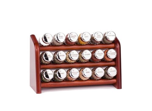 Półka z przyprawami polskiej firmy GALD wykonana z drewna bukowego trwale pokrytego potrójną warstwą lakieru ekologicznego. Pojemniki szklane z plastikowymi nakrętkami dostępne w wersji matowej lub z połyskiem.