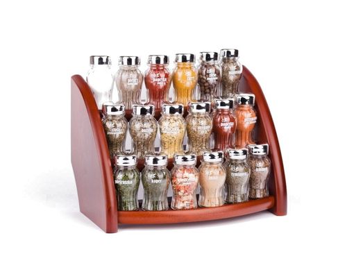 Półka z przyprawami polskiej firmy GALD wykonana z drewna bukowego trwale pokrytego potrójną warstwą lakieru ekologicznego. Pojemniki szklane z plastikowymi nakrętkami dostępne w wersji matowej lub z połyskiem.