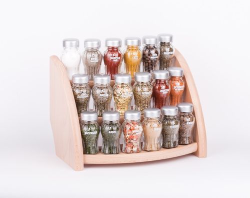 Półka z przyprawami polskiej firmy GALD wykonana z drewna bukowego trwale pokrytego potrójną warstwą lakieru ekologicznego. Pojemniki szklane z plastikowymi nakrętkami dostępne w wersji matowej lub z połyskiem.