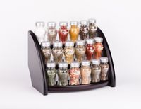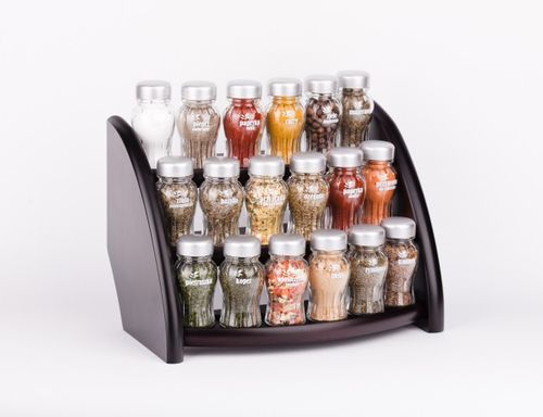 Półka z przyprawami polskiej firmy GALD wykonana z drewna bukowego trwale pokrytego potrójną warstwą lakieru ekologicznego. Pojemniki szklane z plastikowymi nakrętkami dostępne w wersji matowej lub z połyskiem.