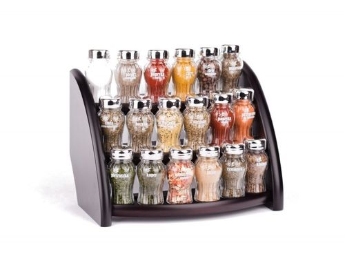 Półka z przyprawami polskiej firmy GALD wykonana z drewna bukowego trwale pokrytego potrójną warstwą lakieru ekologicznego. Pojemniki szklane z plastikowymi nakrętkami dostępne w wersji matowej lub z połyskiem.