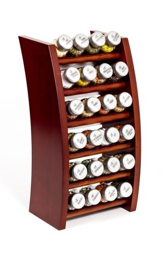 Półka z przyprawami polskiej firmy GALD wykonana z drewna bukowego trwale pokrytego potrójną warstwą lakieru ekologicznego. Pojemniki szklane z plastikowymi nakrętkami dostępne w wersji matowej lub z połyskiem.