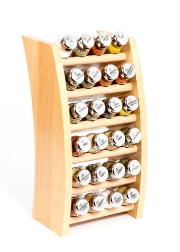 Półka z przyprawami polskiej firmy GALD wykonana z drewna bukowego trwale pokrytego potrójną warstwą lakieru ekologicznego. Pojemniki szklane z plastikowymi nakrętkami dostępne w wersji matowej lub z połyskiem.