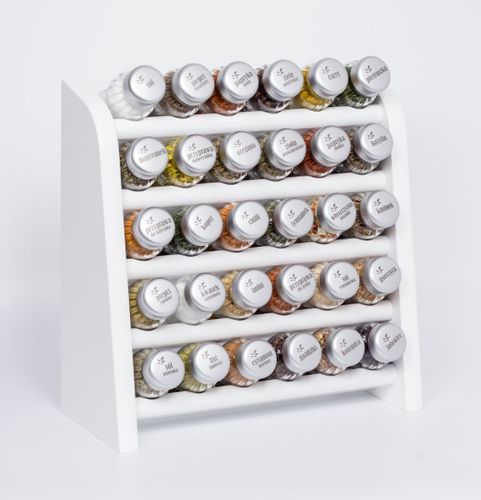Półka z przyprawami polskiej firmy GALD wykonana z drewna bukowego trwale pokrytego potrójną warstwą lakieru ekologicznego. Pojemniki szklane z plastikowymi nakrętkami dostępne w wersji matowej lub z połyskiem.
