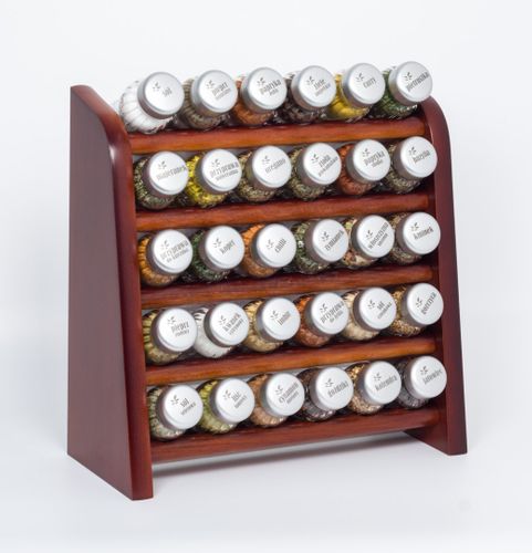 Półka z przyprawami polskiej firmy GALD wykonana z drewna bukowego trwale pokrytego potrójną warstwą lakieru ekologicznego. Pojemniki szklane z plastikowymi nakrętkami dostępne w wersji matowej lub z połyskiem.