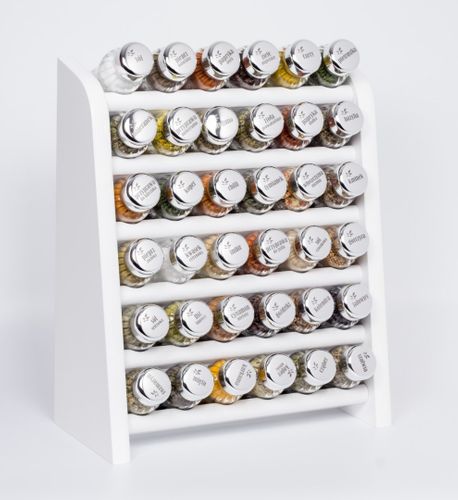 Półka z przyprawami polskiej firmy GALD wykonana z drewna bukowego trwale pokrytego potrójną warstwą lakieru ekologicznego. Pojemniki szklane z plastikowymi nakrętkami dostępne w wersji matowej lub z połyskiem.